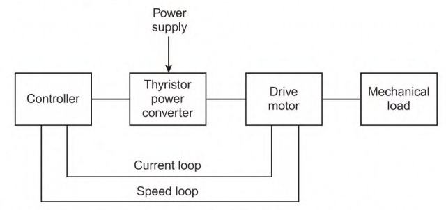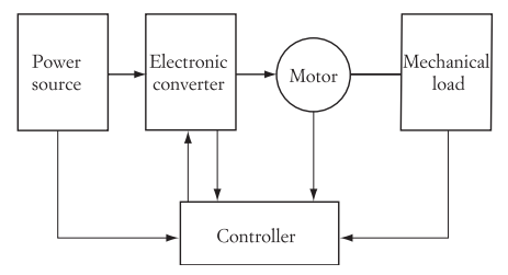 Five functional blocks: Power source, converter, motor, transmission, load – with controller providing intelligence