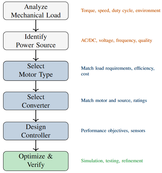 Component selection: Load and source are predetermined; designer selects motor, converter, and controller