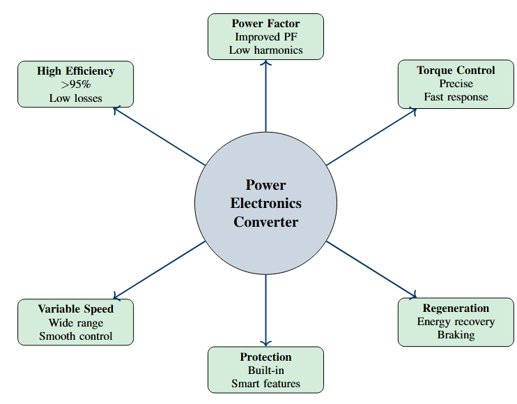 Fixed Power Source \(\xrightarrow{\text{Converter}}\) Variable Speed Motor