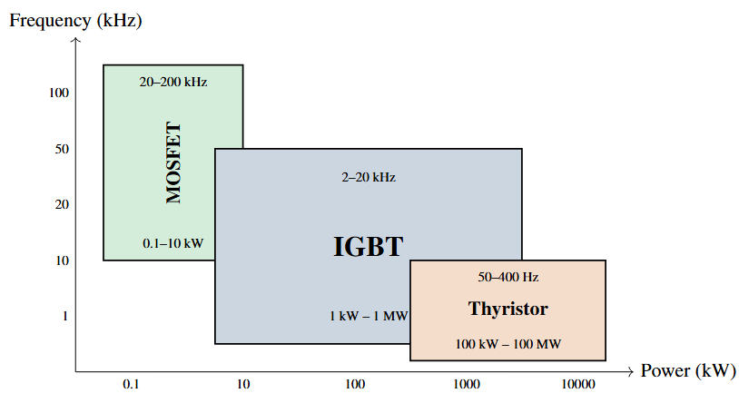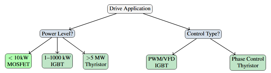 IGBT: Industry standard for modern drives (1 kW – 1 MW), best balance of performance